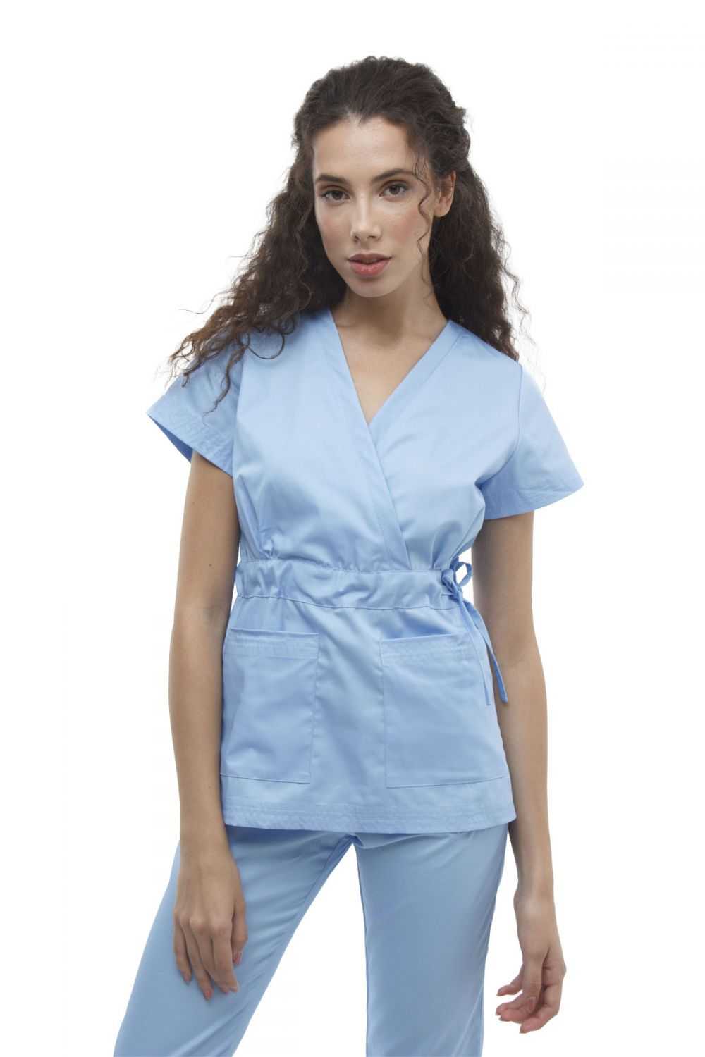 V-neck blouse with side-over-side, scoop neckline, with two roomy patch pockets at the bottom. Adjustable waistband with side drawcord.
