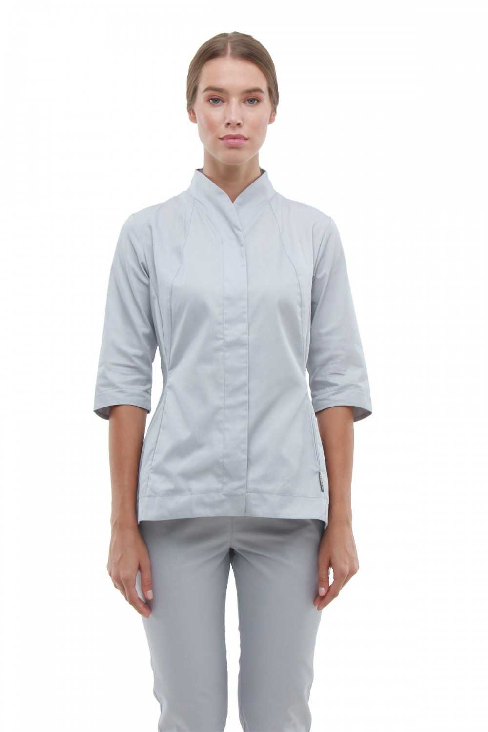 Jacheta asimetrică, cambrată, cu guler ridicat, mâneci 3/4 și două buzunare ascunse. Jacheta are deschidere completă în față datorită capselor metalice ascunse.