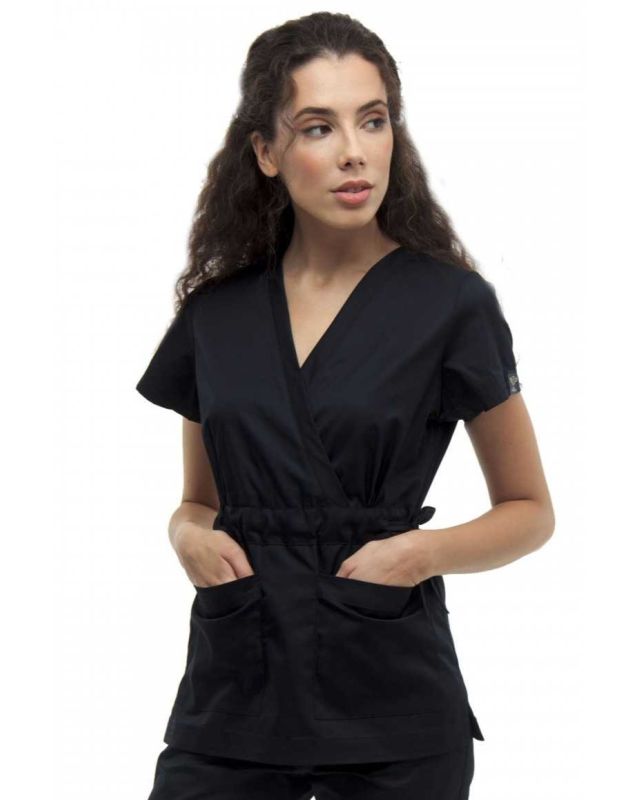Blúz V-nyakkivágással és átlapolt dizájnnal, testhezálló, elegáns megjelenésért. Két tágas, alkalmazott zseb található az alsó részen, valamint állítható derék oldalsó kötővel, amely személyre szabott kényelmet és professzionális megjelenést biztosít.