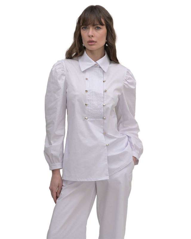 A tálcát díszvarrások díszítik, rejtett cipzárral és díszgombokkal rögzítik. Lámpás-stílusú ujjak alul ráncolt mandzsettákkal.
